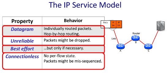 无连接的(connectionless):IP不维护与通信相关的任何状态。例如当进行一个持续数十分钟的Skype通话,其包含了许多packets,但IP层对该童话并不了解,只是将每个packet独立的进行路由。