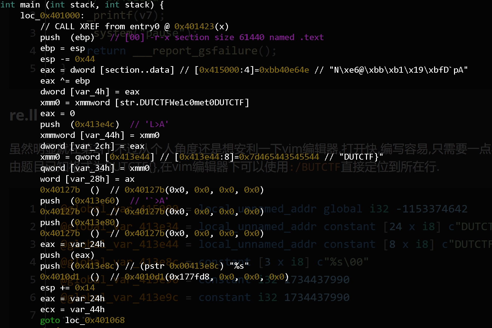 现在来re.ll文件找while循环到底判定了个什么, 答案很明显在第2行, 不过从个人角度还是想安利一下vim编辑器, 打开快, 编写容易, 只需要一点学习成本, 便可以让自己在未来的很多内容中省掉很多不必要的操作.