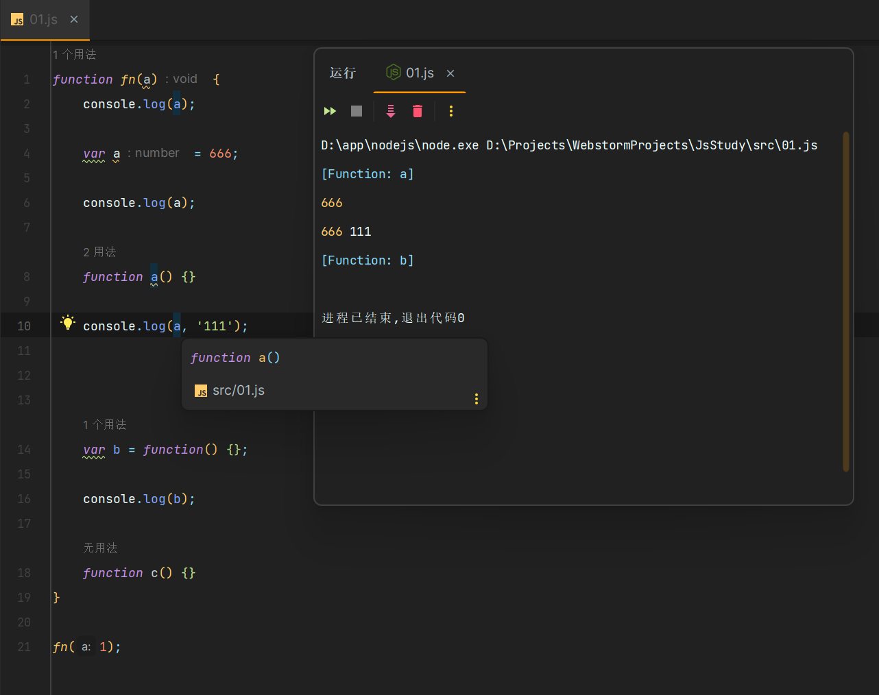function a() {}是函数声明,在fn的作用域内会被优先读取,然后才执行代码,此时第一个console.log是打印函数 a 而不是传进来的变量 a,至于为什么fn(a)里的a没被标记未使用是因为js没有类型检查。不然这个会报错。