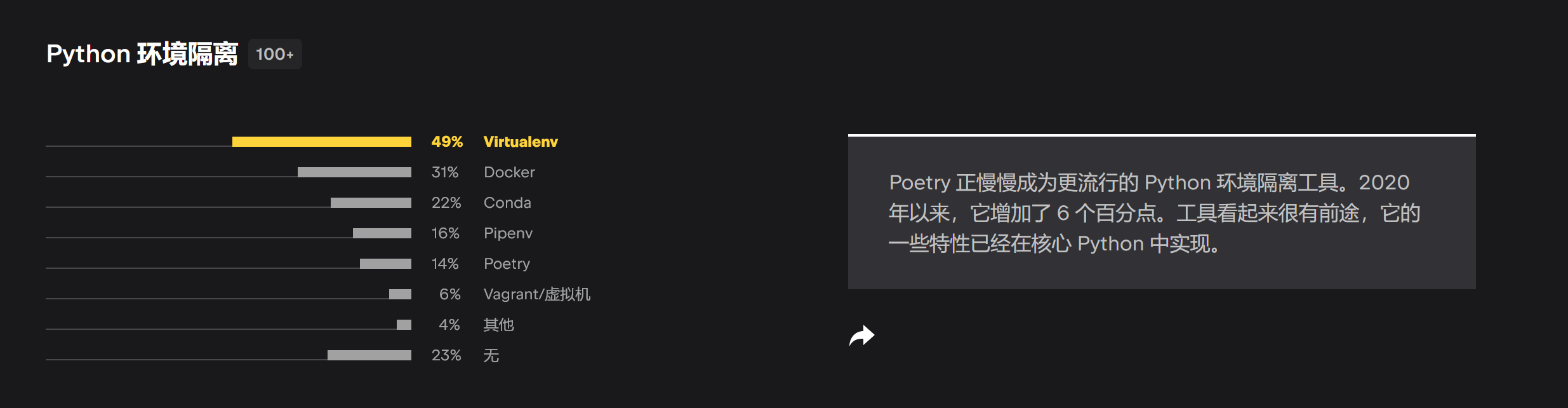 uncle-lv2 years agopoetry的使用体验和稳定性怎么样?可以上生产环境吗?poetry的使用体验和稳定性怎么样?可以上生产环境吗? 感觉社区对poetry的评价很高,但在实际项目中很少看到有人使用。 在Jetbrains的2022年Python开发者调查里占比也不高。 有用过的小伙伴可以谈谈体验吗?157 views30Share